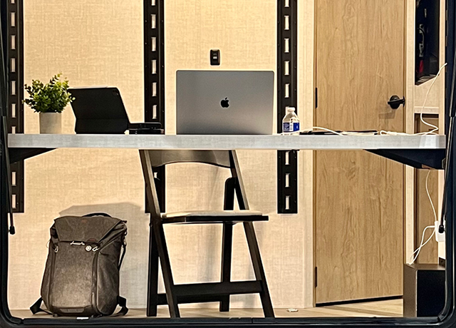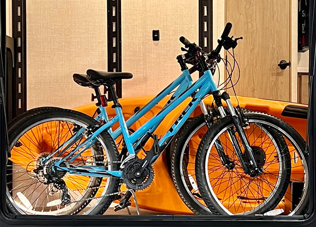 Available on select E-Series floorplans, EmberTrack™ is Ember’s repositionable mounting system designed to enhance versatility inside and out. Secure bikes, kayaks, coolers, and gear with ease, or convert the space into a workstation or bunks, all without the need for aftermarket drilling or modifications.